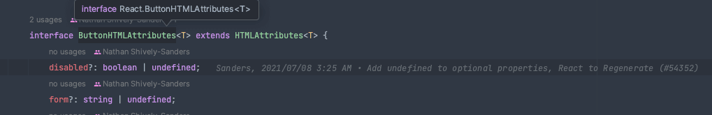최근에 디코에서 지인분께서 동료분들과 이야기하면서 나온 의문에 대해서 혹시 아시는 바가 있냐고 여쭤보신 적이 있었다. DefinitelyTyped에서 정의해서 배포 중인 React 타입 중 ButtonHTMLAttributes와 같은 inferface에 optional 속성임에도 undefined가 Union 타입으로 잡혀있는 부분에 대한 의문이었다.